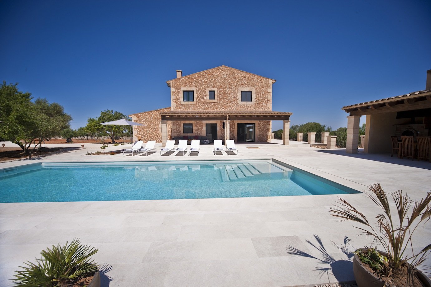 The tranquil setting and large grounds of this beautiful house Villa Can Valls will ensure a private and relaxing holiday. The villa counts with 4 bedrooms all with en suite bath rooms a very large dining and lounge area connected to to the modern kitchen. Behind the kitchen is a second dining area all with direct access to the surrounding terraces.Next to the covered terrace with lounge sofas is a large swimming pool and a sun bath area with 8 sun beds to enjoy the sun. Near the pool area is an outdoor kitchen with pizza oven, a BBQ and an outdoor dining area for long al fresco lunches and dinners. There is also an outdoor toilet and a shower. The villa is provided with all modern facilities like air conditioning though out, alarm system, electric gates, internet and central heating.Villa Can Valls is a newly constructed, very spacious luxury villa situated between the towns of Campos and Santanyi near the sandy beach of Es Trenc.